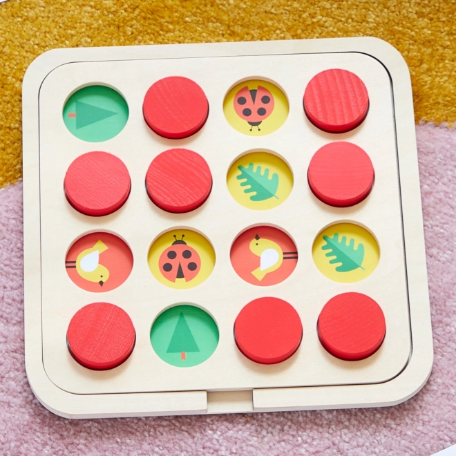 Zabavna in izobraževalna spominska igra iz trajnostnega materiala, ki raste z otroki. Zahvaljujoč setu zamenljivih kart lahko igro kadarkoli prilagodite temi – od narave in živali do sadja, igrač ali vozil. Veliki in robustni leseni žetoni so idealni za majhne ročice ter spodbujajo fino motoriko, spomin in koncentracijo.