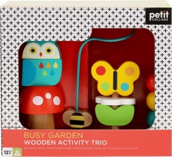 Petit Collage motorični labirint Vrt Activity Trio je čudovito izdelana lesena igrača, ki ponuja trojico različnih aktivnosti. Otroci lahko uživajo v nameščanju, premikanju in vrtenju živalskih figuric in drugih delov te igrače. Njegova enostavna, a privlačna zasnova spodbuja razvoj kognitivnih spretnosti in domišljijo otrok.