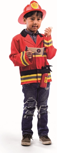 Spremenite male junake v akciji s tem realističnim gasilskim kostumom. V kompletu so rdeč plašč, nastavljiva čelada in bogati dodatki za kreativno igro. Preprosto zapiranje na ježka, varni materiali in podrobna izdelava spodbujajo domišljijo in igre igranja vlog.