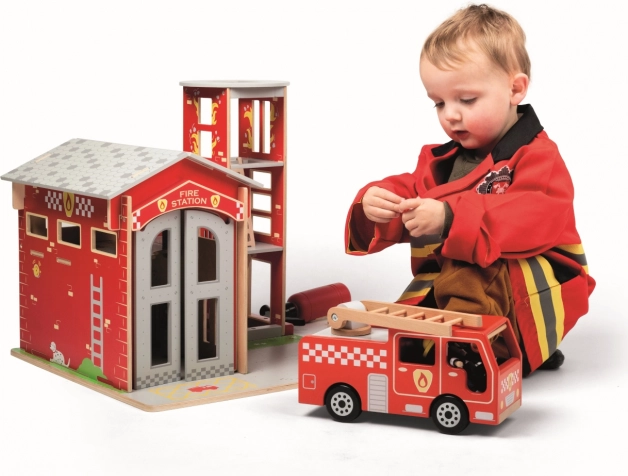 Otroški gasilski kostum BIGJIGS TOYS ponuja vse, kar mali gasilci potrebujejo za napeto reševalno misijo. Svetlo rdeč plašč s črtastimi rokavi in emblemom, nastavljiva čelada (49–55 cm) ter dodatki, kot so lesen gasilni aparat, radijska postaja in megafon, dajejo igri realističen značaj.