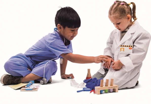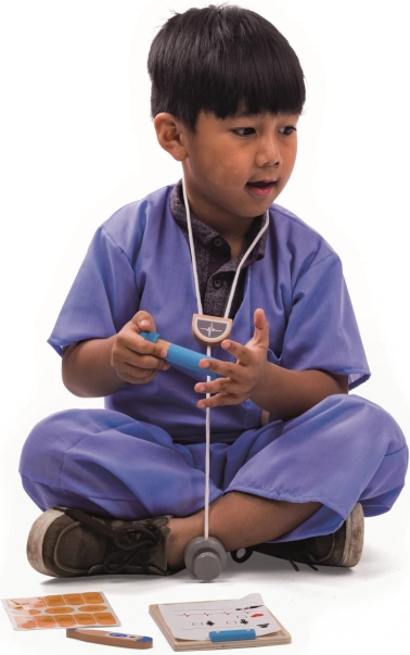 Otroški zdravniški kostum BIGJIGS TOYS vsako igro spremeni v reševalsko misijo. V kompletu so modra majica in hlače z ježki za enostavno oblačenje in slačenje ter bogati dodatki: lesen stetoskop, zdravniška tabla za zapiske, termometer, žepna ura, injekcijska brizga in obliži. Kostum je izdelan iz bombaža in poliestra ter ga je mogoče prati v pralnem stroju.