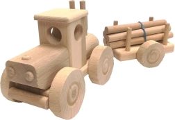 Zaradi zaobljenih robov in skrbnega poliranja je igrača prijetna na dotik in varna za otroke od 3. leta. Vrteča se kolesca in funkcionalno pripenjanje prikolice podpirajo razvoj fine motorike, domišljijo in vloge kmeta ter gozdarske tehnike.