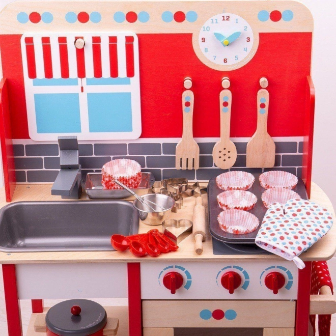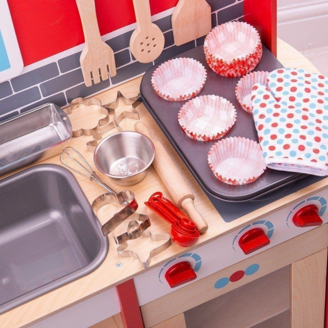Ta celovit pekovski set vsebuje vso opremo, ki jo vsak mali kuhar potrebuje za svoje prve pekovske poskuse. Vključuje pekač, kuhinjsko prijemalko, model za hlebec, metlico za stepanje, lesen valjar, skledo, set merilnih žlic in šest modelčkov za izrezovanje testa.