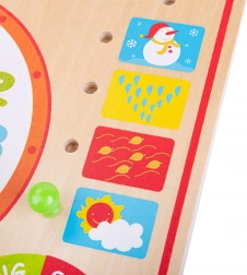 Plošča je pregledna, vsebuje veliko uro s premičnima kazalcema ter vrtljive ali pomične kazalnike za dneve, mesece, vreme in letne čase. Osnovni napisi so v angleščini, zato otrok naravno pridobiva tudi jezikovni vpogled. Izdelek je izdelan iz trpežnega, odgovorno pridobljenega lesa in je primeren za vsakodnevno domačo ali vrtčevsko uporabo.
