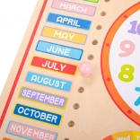 Velika ura s premičnima kazalcema in pregledni razdelki za dneve in mesece pomagajo otrokom zlahka razumeti minevanje časa in se orientirati v koledarju.