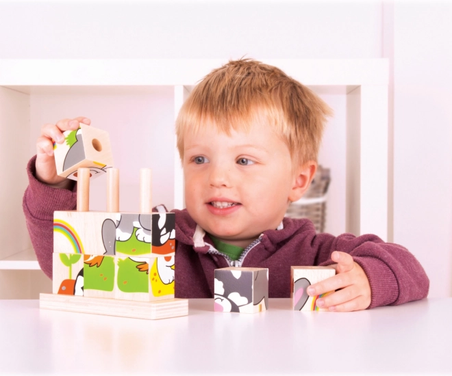 Set vsebuje skupaj 10 delov – 9 kock, ki ustvarijo 4 različne slike, ter leseno osnovo s palčkami za varno in pregledno sestavljanje. Igrača je izdelana iz trpežnega lesa z gladko površino in izpolnjuje aktualne evropske varnostne standarde.