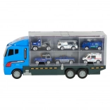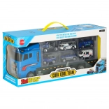 Velik moder tovornjak združuje funkcijo skladiščnega prostora z možnostjo igre. Omogoča prevoz do 14 majhnih kovinskih avtomobilčkov, ki so del kompleta. Avtomobilčki realistično posnemajo prave policijske in interventne vozila. Tovornjak ima dve strani s prozornimi vrati in varnostnimi ključavnicami, kar zagotavlja, da avtomobilčki ne padejo med vožnjo. Vključuje tudi izstreljevalnik avtomobilčkov na sprednjem delu, kar dodaja igri dodatno dimenzijo.
