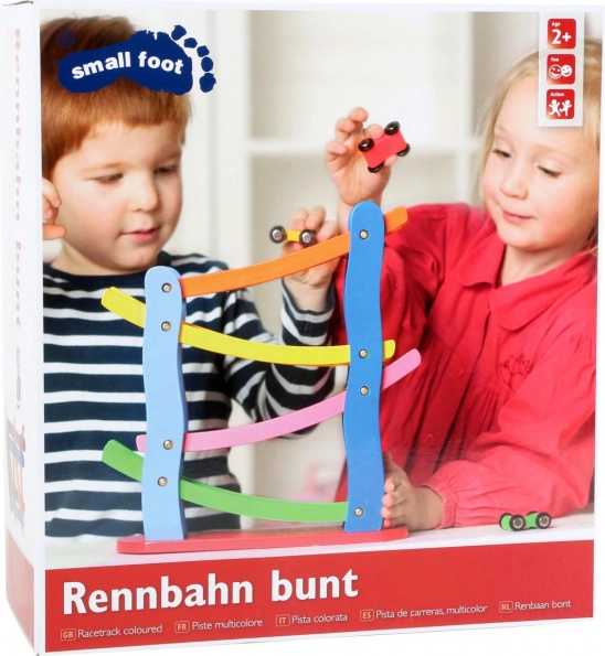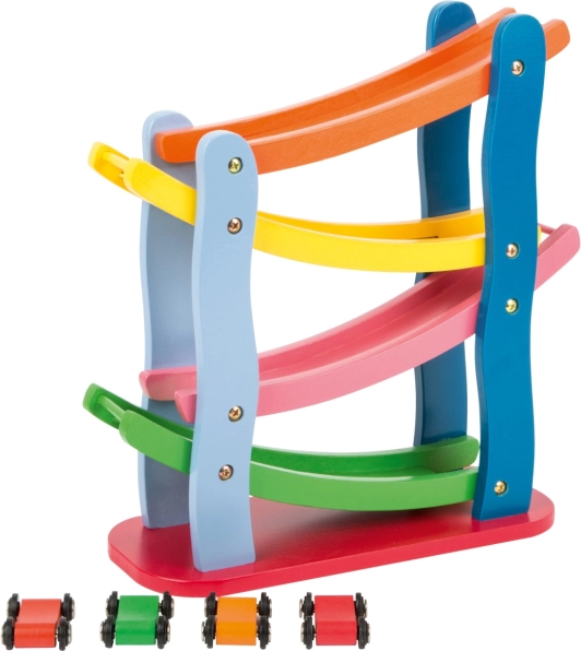 Lesena dirkalna steza za otroke je barvita igrača, ki nudi zabavo za dolge ure. Z barvitimi avtomobilčki otroci razvijajo motoriko in prepoznavajo barve, ko z veliko hitrostjo drvijo po trdnih lesenih tirih navzdol.