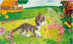 Otroci sestavijo slike gosi ob potoku, kužka na travniku ali pujskov pri hlevu – žive barve in prisrčne ilustracije spodbujajo domišljijo in spoznavanje živali.