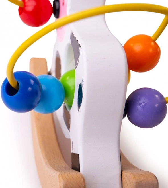 Prisrčen lesen motorični labirint v obliki kravice na gugalnici spodbuja fino motoriko, koordinacijo oko–roka in zbranost. Pisane kroglice na jekleni žički vabijo k premikanju, kravica se nežno ziblje in otroci tako razvijajo veščine skozi zabavno igro. Izdelano iz kakovostnega lesa, skrbno obdelanih materialov in v skladu z evropskimi varnostnimi standardi.