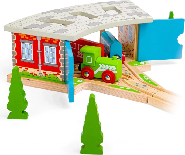 Praktična in zabavna razširitev za vašo leseno železnico: trojna lokomotivna lopa z vrati znamke Bigjigs Rail ponuja varno »parkiranje« lokomotiv in vagonov, zahvaljujoč pametnim kretnicam pa omogoča vožnjo v tri smeri. Izdelana je iz kakovostnega lesa, je združljiva z večino lesenih železniških prog na trgu in izpolnjuje evropske varnostne standarde.