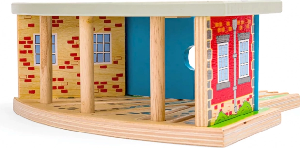 Trojna lokomotivna lopa z vrati je idealen dodatek za vsakega malega strojevodjo. Zahvaljujoč trem stojem in vgrajeni povezavi tirov boste zlahka organizirali promet na progi in pospravili vlakce po dnevu polnem vožnje. Trdna lesena konstrukcija z barvnimi podrobnostmi deluje realistično in prenese tudi intenzivno igro.