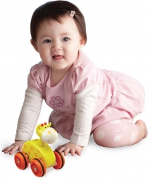 Ta vesela žirafa na kolescih je idealno prvo vozilce za otroške roke. Z nagibanjem igrače otrok preprosto spreminja smer vožnje, kar naravno razvija koordinacijo oko–roka in spodbuja aktivno igro. Gumijasti obročki na kolescih zagotavljajo tekoče in tiho delovanje na različnih površinah.