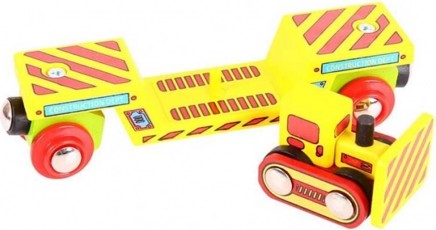 Zabaven komplet za lesene vlakovne proge vključuje težkotoni vagon z magnetnimi spojniki, odstranljiv buldožer in dve tirnici. Združljivost z večino lesenih vlakovnih prog, kakovostni naravni materiali ter spodbuda domišljije in fine motorike ga naredijo odličen dodatek vsaki železnici.