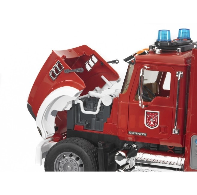 Doživite akcijo kot pri pravih gasilcih. Ta podrobno izdelan model BRUDER MACK Granite ponuja popolnoma delujočo vodno brizgalno črpalko in lestev, izvlečno do 120 cm, ki se vrti za 360°. Stabilizacijske opore zagotavljajo trdno osnovo med »intervencijo«, medtem ko svetlobni signal z sireno (BR2801) poskrbi za pristno doživetje igre.