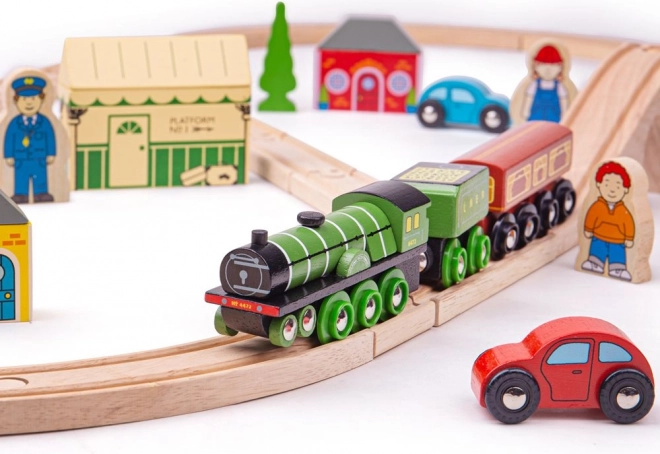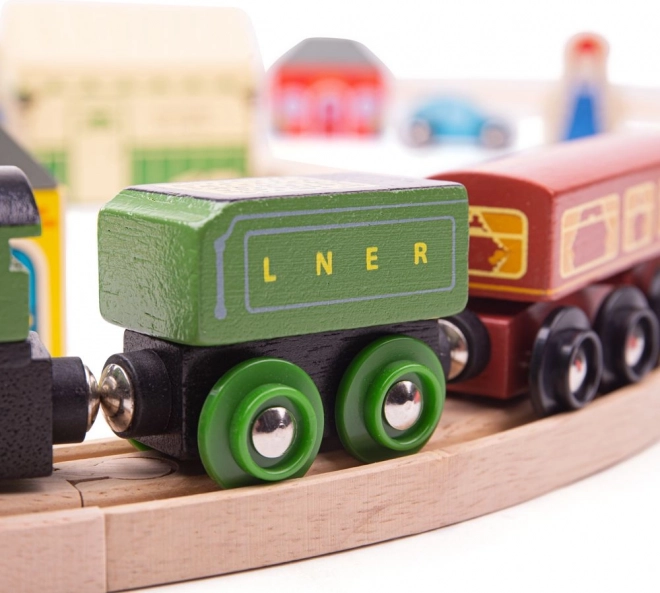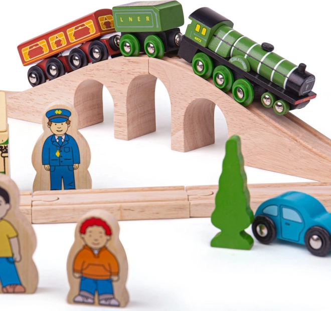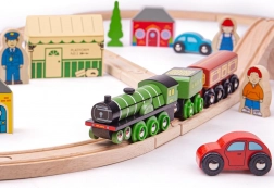 Flying Scotsman sodi med najbolj znane vlake svoje ere in z to leseno železniško progo lahko otroci ponovno doživijo njegova slavna potovanja. Set vsebuje lepo izdelan vlak, ki vas popelje na nostalgično vožnjo, polno viaduktov in naravnih scen. Del seta so tudi retro postaja, hiše in avtomobili ob progi.