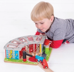Depo vključuje drsna vrata in dve naftni sodčki, ki spodbujajo otroško domišljijo med igro.
