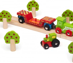 Ta barvit set prinaša v otroški železniški svet še več domišljije. Traktor lahko z vagončka snamete in ga uporabite pri igri na kmetiji ali pa ga s pomočjo nakladalne ploščadi naložite ter odpravite na pot po tirih. Zahvaljujoč magnetnim sklopnikom se vagonček hitro poveže z lokomotivo in drugimi vagoni, zato je razširitev obstoječe garniture vprašanje trenutka.