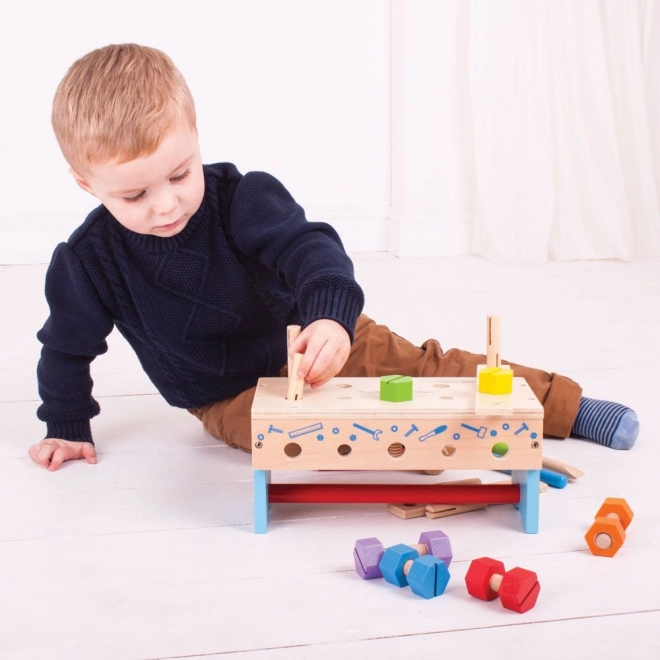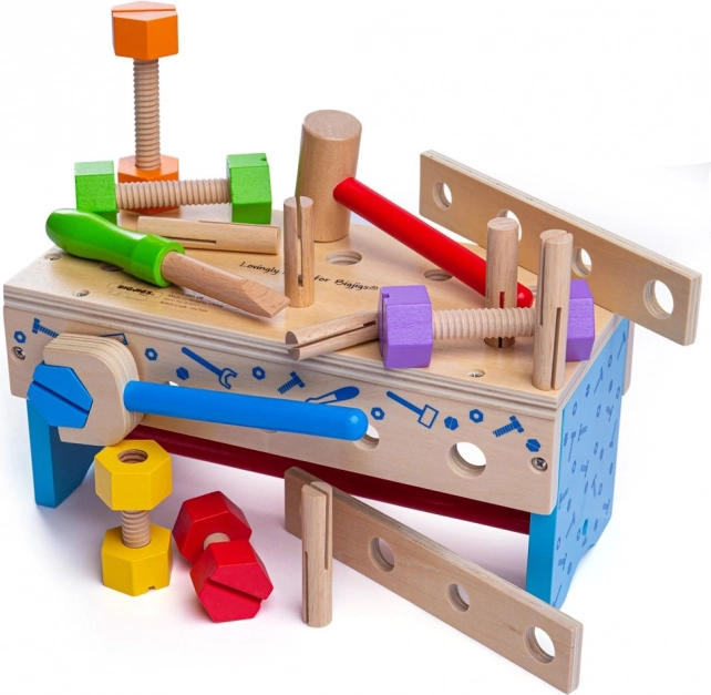 Igrača Bigjigs Toys prinaša kakovostno leseno delovno mizo z orodji, ki na zabaven način podpira ustvarjalne spretnosti in motorični razvoj otrok. Vključuje kladivo, ključ in različne vijake, ki jih otroci lahko enostavno uporabijo za različne gradbene aktivnosti.