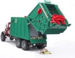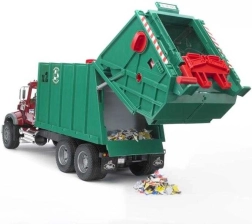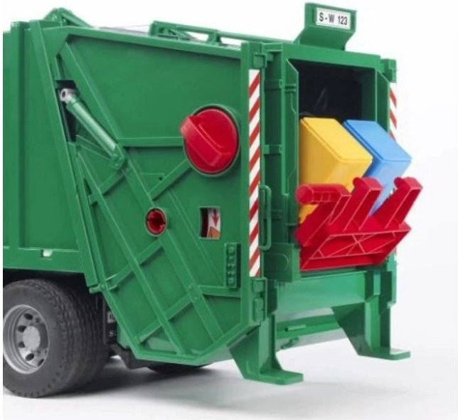 Popolnoma funkcionalna dvižna naprava izprazni smetnjake v zbiralnik, kjer stiskalnica za odpadke material potiska v zadnji del vozila. Po napolnitvi je mogoče zadnji del odpreti in tovor izprazniti. Vse dopolnjujejo odpirajoča se vrata kabine, nagibni pokrov motorja z vpogledom v motor in zložljiva vzvratna ogledala. Model je izdelan v Nemčiji iz kakovostne plastike in prenese tudi intenzivno otroško igro.