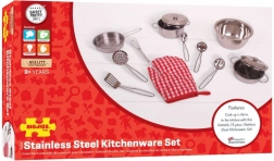 Ta realističen komplet kovinske posode BIGJIGS TOYS je zasnovan za male ročice in otrokom prinaša avtentično izkušnjo kuhanja. Lonec, ponve in zajemalke dopolnjuje praktična kuhinjska rokavica, zahvaljujoč kateri je igra varna in zabavna. Komplet razvija fino motoriko, koordinacijo oko–roka ter podpira socialne veščine pri skupni igri.
