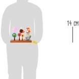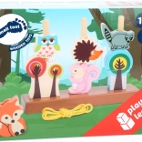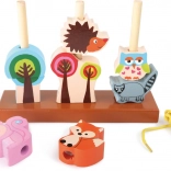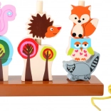 Ta kakovosten leseni komplet združuje zlaganje in nizanje v eno pametno igro. Otroci lahko ježa, lisico, veverico, rakuna in sovo zložijo na stojalo s tremi količki ali jih nizajo na priloženo vrvico. Deli so robustni, dobro ležijo v otroški roki in s svojimi barvami spodbujajo domišljijo.