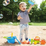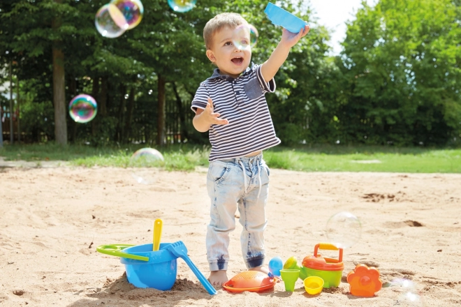 Vse, kar otroci potrebujejo za gradnjo in oblikovanje: vedro s sitom, zalivalka, lopatke, grabljice in modelčki v živahnih barvah.