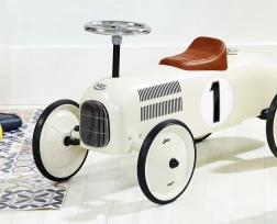 Zahvaljujoč gumiranim kolesom je vožnja tiha tudi na trdih podlagah, zato je poganjalec primeren tako za stanovanje kot za pločnik. Retro dizajn izstopa v vsaki otroški sobi in spodbuja domišljijo ter veselje do gibanja.