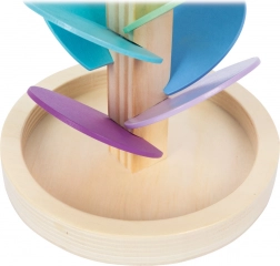 Vsak barvni listič je drugačne velikosti in ob stiku s kroglico postopoma ustvarja tone od višjih do nižjih. Otroci tako urijo sluh, zbranost in potrpežljivost.