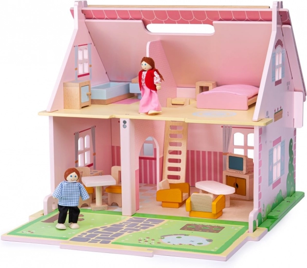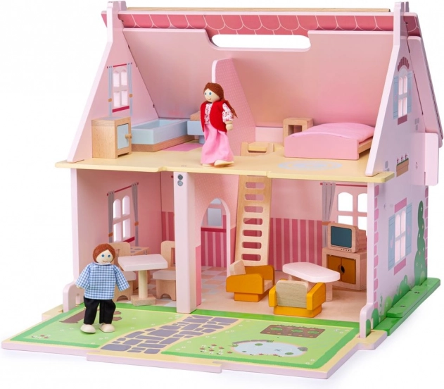 Ta kakovostna lesena hišica je zasnovana za neskončne ure domišljijske igre. Zahvaljujoč dvigalu, terasi in bogati opremi pohištva otroci zlahka ustvarijo svoje zgodbe in prizore. Vgrajen ročaj omogoča, da hišico udobno prenašate in vzamete zabavo kamor koli.