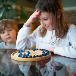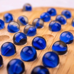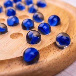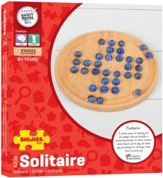 Odkrijte brezčasno zabavo z lesenim soliterjem BIGJIGS TOYS. Sijoče modre kroglice in skrbno obdelana okrogla plošča ustvarjajo elegantno logično igro, ki preveri vaš preudarek in potrpežljivost. Cilj je s preskakovanjem kroglic postopoma pustiti na plošči le eno kroglico.