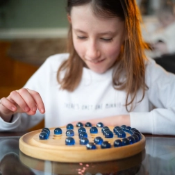 Klasični leseni soliter z 32 steklenimi kroglicami na okrogli plošči razvija logiko, strateško razmišljanje in soustreditev že od malih nog. Izdelan iz kakovostnega trajnostnega lesa, izpolnjuje evropske varnostne standarde in je idealen za mirno igro enega igralca.