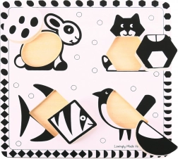 Črno‑bele vstavljanke BIGJIGS TOYS so posebej zasnovane za dojenčke in malčke, ki najbolje reagirajo na visok kontrast. Štiri robustne lesene oblike se vstavljajo v ploščo z ilustriranimi motivi živali, kar otroke spodbuja k ponovnemu poskušanju in naravno krepi koordinacijo oko–roka.