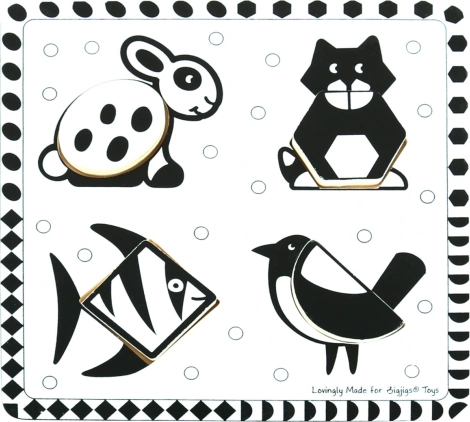 Odkrijte prve puzzle za najmlajše – kakovostne lesene vstavljanke v kontrastni črno‑beli izvedbi. Kontrastne barve dojenčki zlahka zaznajo, zato igra odlično podpira njihove prve zaznave. Veliki masivni koščki so za otroke enostavni za prijemanje, spodbujajo fino motoriko, čutne spretnosti in sposobnost koncentracije. Izdelano iz odgovorno pridobljenega lesa, izdelek izpolnjuje evropske varnostne standarde.