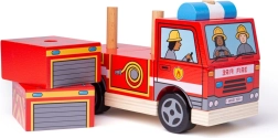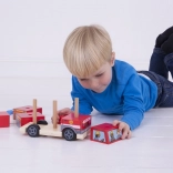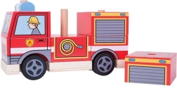 Ta pametna igrača združuje zabavo in učenje: otroci nizajo posamezne dele na lesene palice, urijo koordinacijske spretnosti, prepoznavanje oblik in barv, nato pa se s končnim gasilskim avtom podajo v akcijsko zgodbo. Robustni les, gladki robovi in izrazite barve zagotavljajo varno in privlačno igro.