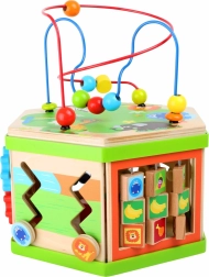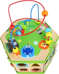 Odkrijte veselje do učenja z večnamensko leseno kocko, polno interaktivnih dejavnosti. Dizajn z veselimi safari živalmi prebuja radovednost in ustvarjalnost vašega otroka.