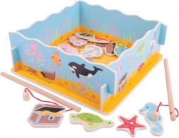 Otroci z magnetnima palicama lovijo 11 ribic in druge kose, kot so skrinja z zakladom, čevelj in sidro, ter vadijo natančnost pri njihovem nameščanju na prava mesta. Kakovostna lesena izdelava in varne barve zagotavljajo dolgo življenjsko dobo in varno igro.