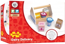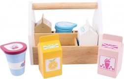 Ta robusten lesen zabojček skriva štiri kartone pijač (mleko, pomarančni sok, jagodni in čokoladni mlečni napitek) ter lonček jogurta in smetane. Odličen dodatek k otroški kuhinjici ali trgovinici, ki otrokom na igriv način približa osnove zdrave prehrane in izvor živil.