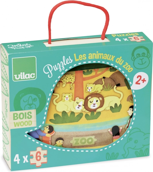 Lesene puzzle z motivom ZOO ponujajo zabavo za otroke od 2 let. Vsebujejo štiri sestavljanke, vsaka s šestimi koščki, in so praktično shranjene v lesenem zabojčku z bombažnim ročajem.