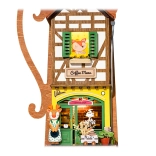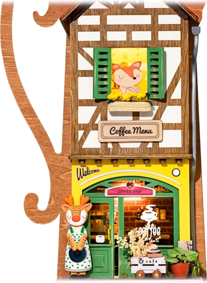 Vsebina paketa vključuje vse potrebno za montažo, vključno z lesenimi delci, dekoracijami, barvami, lepilom, čopičem in pinceto. Osvetlitev je enostavno nastavljiva in hitro pripravljena za uporabo s stikalom. Mikro baterije (2x AAA) niso priložene, priložena so podrobna navodila.