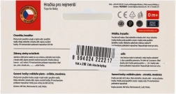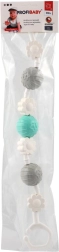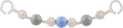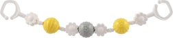 Zahvaljujoč sponkam/očescem na obeh koncih igračko hitro pritrdite na voziček, avtosedež ali rob posteljice. Material je lahek in trpežen, enostaven za vzdrževanje čistoče. Barve se lahko razlikujejo, vendar je vedno ohranjena privlačna kombinacija kontrastnih elementov za vizualno in tipno stimulacijo.
