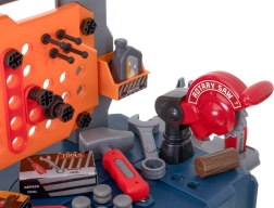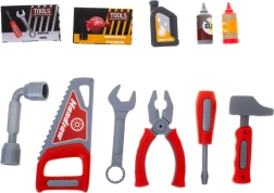 V kompletu so vijaki, matice, žeblji, žagica, ključi, izvijač, kladivce, klešče in spojke – vse za realistično in ustvarjalno igro.
