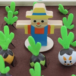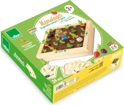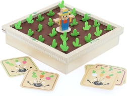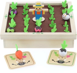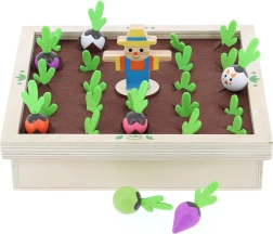 Odkrijte čar vrta za družinsko mizo. Ta čudovita lesena igra s filcnimi elementi prinaša barvite zelenjavne figurice in kartice z recepti, s katerimi se otroci učijo prepoznavati oblike, barve in logične povezave. Igrajte klasični spomin ali skupaj kuhajte juho po receptih – vedno z malce napetosti, ali se bo pojavil navihani zajček.