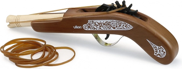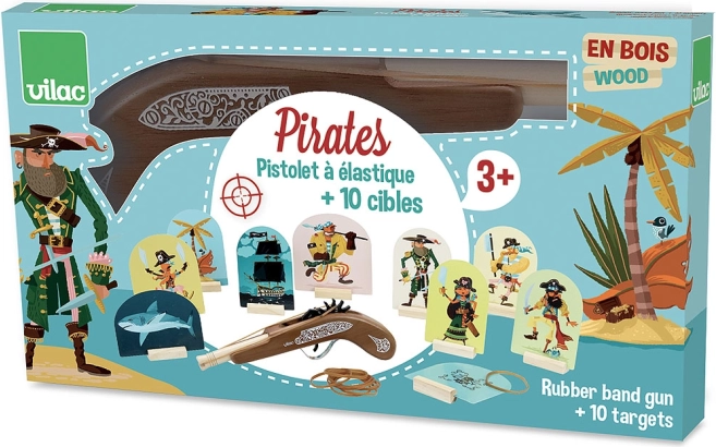 Lesena piratska pištola blagovne znamke Vilac je idealna igrača za majhne navdušence nad piratskimi pustolovščinami. Otrokom omogoča treniranje streljanja na cilj s pomočjo varnih elastik, ki so vključene v komplet.