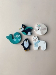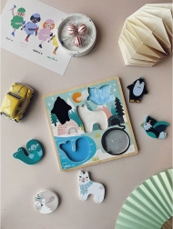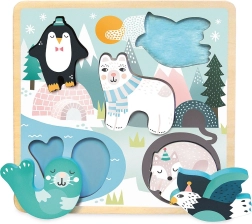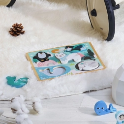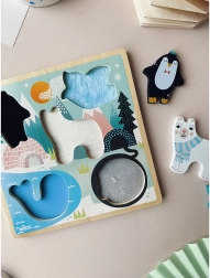 Ta lesena senzorična sestavljanka z motivi polarnih živali (pingvin, polarni medved, tjulenj, kit in ptiček) otrokom prinaša veselje do odkrivanja. Ko odstranijo masivne koščke, podložke z različnimi teksturami spodbujajo zaznavo površin in jih učijo razlikovati oblike ter materiale. Trdna lesena izvedba je odporna in enostavna za prijem tudi za najmanjše roke.