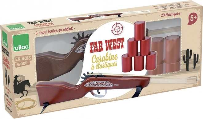 Postanite mali kavboj s to elegantno leseno puško VILAC! Set vsebuje puško na elastike, 20 elastik in 6 mini pločevink za zabavno in varno streljanje. Odlična igra za natančnost, razvoj motorike in tekmovalnega duha za otroke od 5 let dalje.
