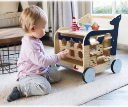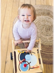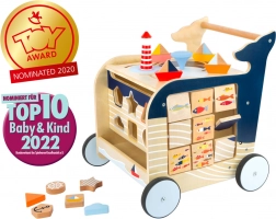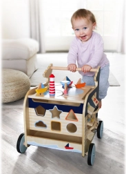 Poiščite svet z lesenim hojnikom v obliki kite. Ta hojnik ne samo pomaga otrokom pri prvih korakih, ampak tudi nudi različne interaktivne igrače, ki spodbujajo razvoj motorike.