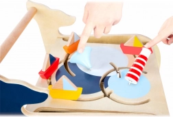 Vključuje vstavljanje oblik, vrtenje slik in risalno tablo, ki spodbujajo razvoj otroške motorike in domišljije.