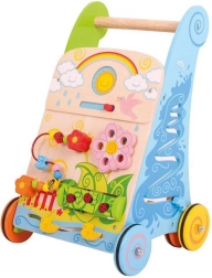 Robustna lesena konstrukcija, zanesljiv ročaj in barvita kolesa podpirajo varen in samozavesten korak malčkov.