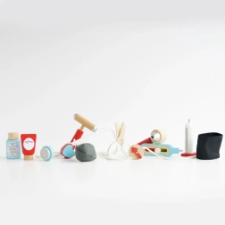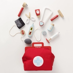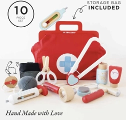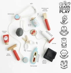 Ta dizajnerska zdravniška torba iz kolekcije Honeybake znamke LE TOY VAN je odlično izhodišče za igro vlog. Vintage tekstilna torba s trdim dnom in lesenimi ročaji skriva 10 skrbno izdelanih dodatkov, ki otrokom omogočajo posnemanje pravega zdravniškega pregleda. Del kompleta so tudi natisljive kartice z »zdravniškim receptom« za še bolj realističen doživljaj.